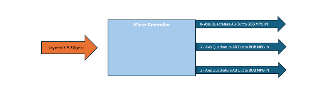 The Arduino micro-controller converts the analog voltage reference into quadrature A/B pulses. This is connected to the USB-BOB MPG A/B inputs ton control axis movement.